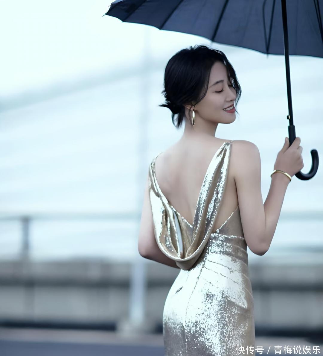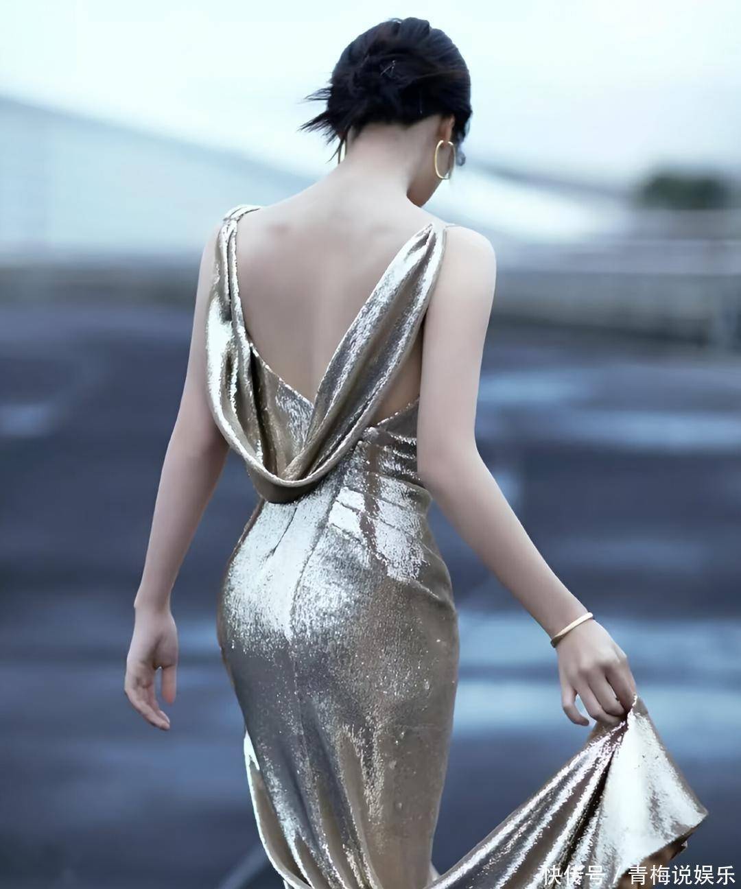 蓝盈莹立于天地之间,仿佛从未来画卷中走出的缪斯。金属光泽的鎏金长裙贴合身形,如液态月光流淌而下,在冷调灰蓝的天际映衬下熠熠生辉。一把纯黑长伞在她手中悄然撑开,不为遮雨,只为划出一方独属的气场。伞影斜落,将她笼罩在神秘与清冷交织的氛围里,仿佛世界喧嚣至此戛然而止。裙摆随风轻漾,露背设计悄然展露优雅的脊线,将性感藏于克制之中。大圈金饰垂坠耳畔,随着步伐微微晃动,折射出摩登而张扬的光。那是力量与柔美的对话,是古典轮廓与现代审美的碰撞。她无需浓妆艳抹,仅凭一身搭配,便让整个场景成为流动的时尚诗篇。灰蓝的天空如薄雾笼罩,既遥远又贴近,为这场视觉盛宴铺陈出冷静底色。鎏金的暖与天光的冷相互角力,黑伞则成为平衡的支点,将华丽压得沉静,将清冷提得耀眼。每一帧画面都像精心调制的色彩实验,浓淡有致,张弛有度。这身造型,是张扬的华丽,还是内敛的宣言?如果你站在那片灰蓝之下,你会选择撑起黑伞,走向人群,还是独自走入风景?